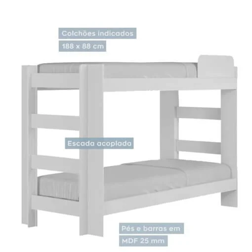 Prático, confortável e compacto, é assim que o ambiente do seu quarto vai ficar com o Kit Beliche Florida com 2 Colchões Solteiro D20 88×188. Produzido em cores neutras, para proporcionar um ambiente mais clássico e atual. A estrutura é feita em MDF, garantido mais resistência e durabilidade. O beliche possui escada e 2 camas de solteiro deixando o local mais formoso e organizado. O acabamento fica por conta da pintura U.V.