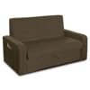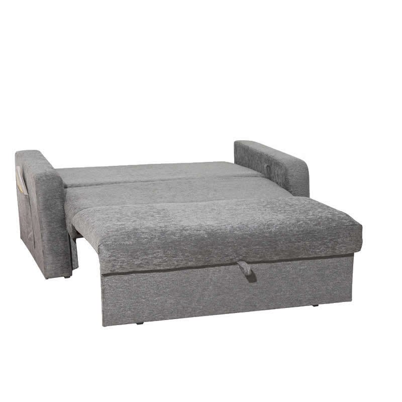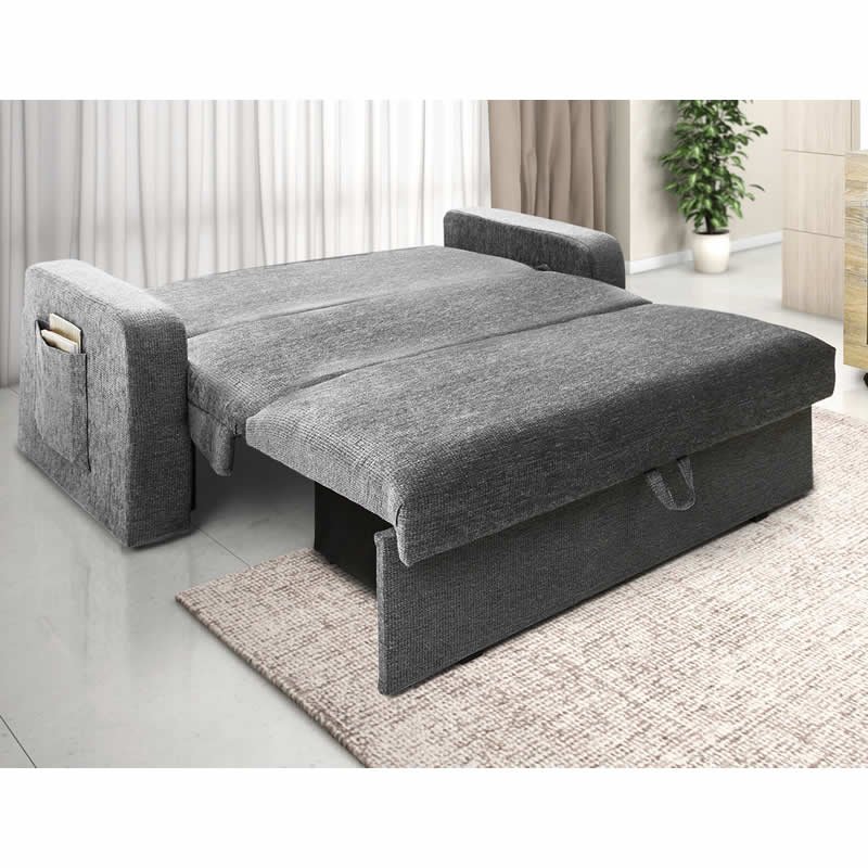 O Sofá Cama Com Baú Tem O Seus Estofado Revestido Com Tecido Cinza, E Preenchido, No Assento E No Encosto, Com Espuma Ds-20. Por Fim, A Sua Estrutura Interna É Construída Com Madeira De Eucalipto E Pinus.